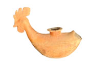 - 津古生掛古墳で出土した鶏の形をした土製品です。トサカが表現されており、雄鳥と考えられます。合計3体の鶏が、墳丘から転げ落ちた状態で出土しました。本来は祭祀に使用され、墳丘上に並べられていたものと考えられます。鶏は夜明けを告げる鳥であり、古墳時代の始まりに造られた津古生掛古墳を象徴するものです。
